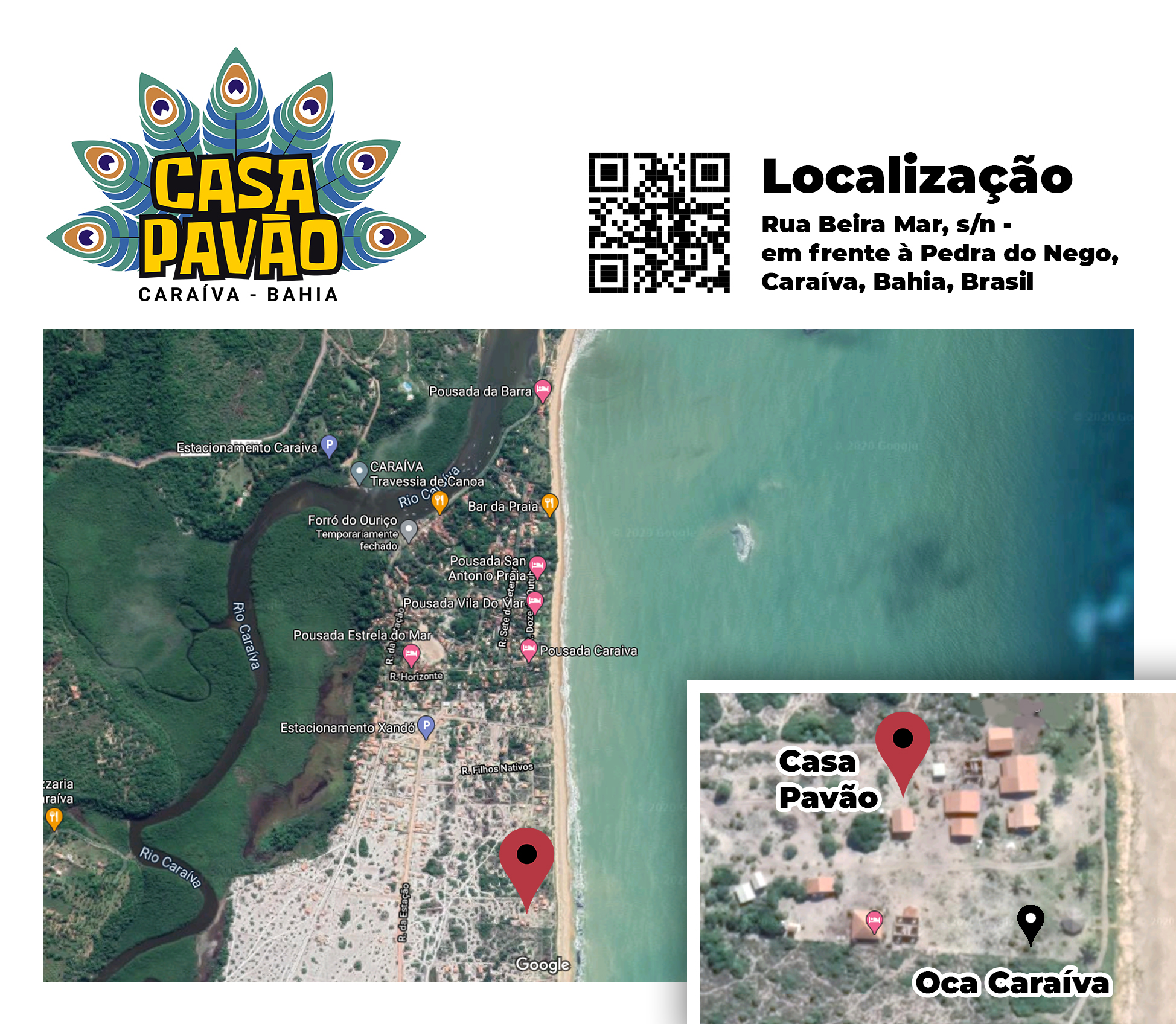 A casa fica em um local paradisíaco a 100 metros do mar e a 800 metros do centro da Vila de Caraíva. Ou seja, são necessários 10 minutos de caminhada pela praia ou 15 minutos pelo bairro indígena para se chegar ao centrinho. Não é longe, agradável para quem gosta de caminhar, em Caraíva tudo se faz andando. Na vizinhança certamente estarão os donos do terreno dessa e outras casas, o casal Iara e Franklin, pessoas incríveis e hospitaleiras que dão ao lugar um toque simples e familiar. Por outro lado, também na vizinhança, está o bar Oca Caraíva que oferece opções de divertimento e alimentação para seus clientes, trazendo um pouco de agito para a redondeza. Como Chegar